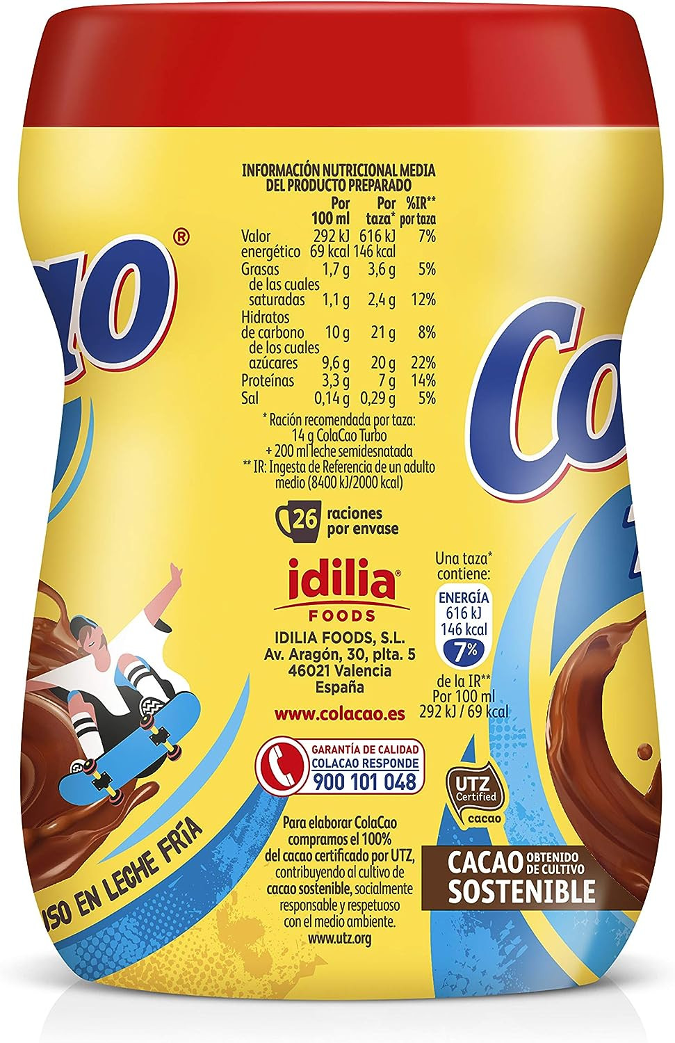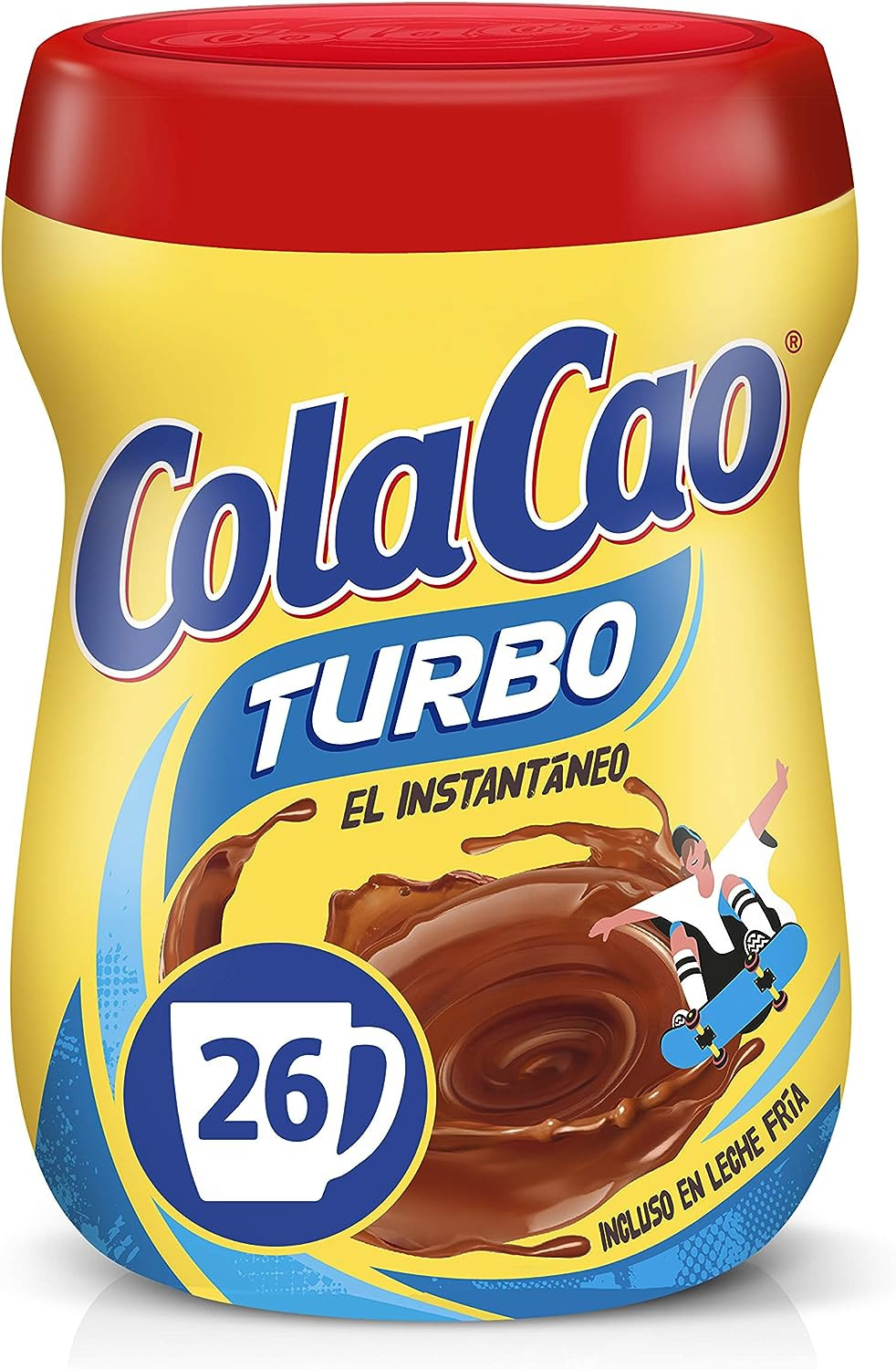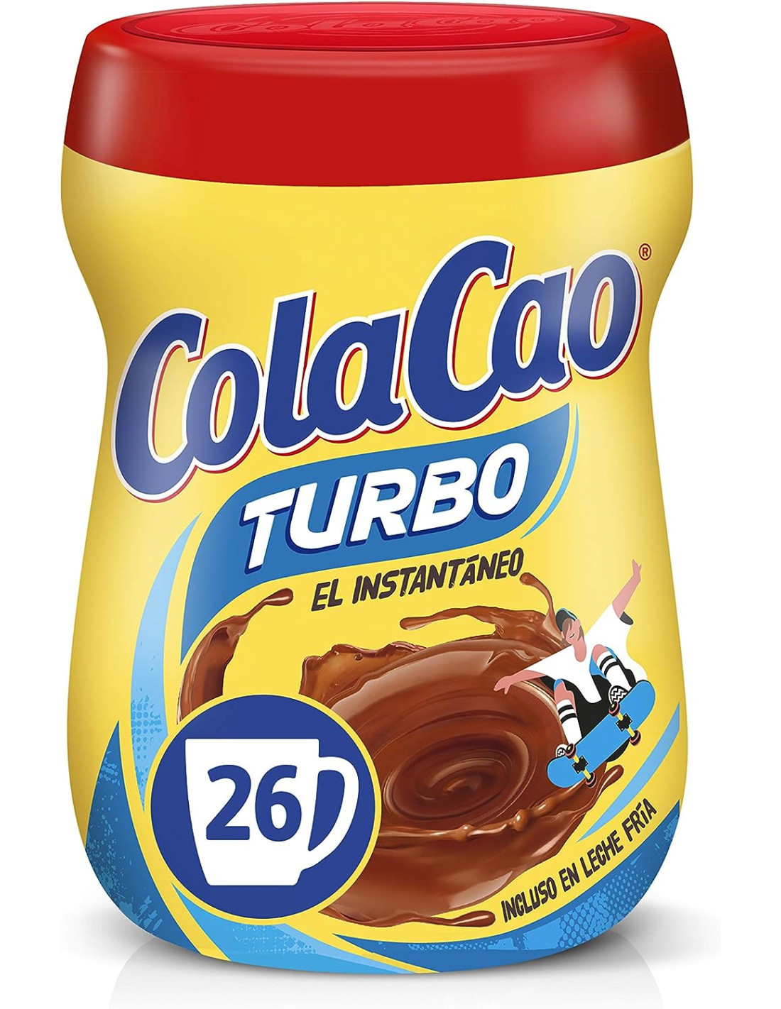 A unique Spanish product loved by children, and not only, for its unmistakable flavor and smooth texture. Cola Cao Turbo is the perfect match for your breakfast or when you just want to drink something sweet and hot. With the TURBO version you don't have to worry about choco lumps, as it mixes well in cold milk so you can enjoy it hot or cold. The best way to enjoy Cola Cao is dissolving a table spoon of it with traditional milk, soy or almond milk.