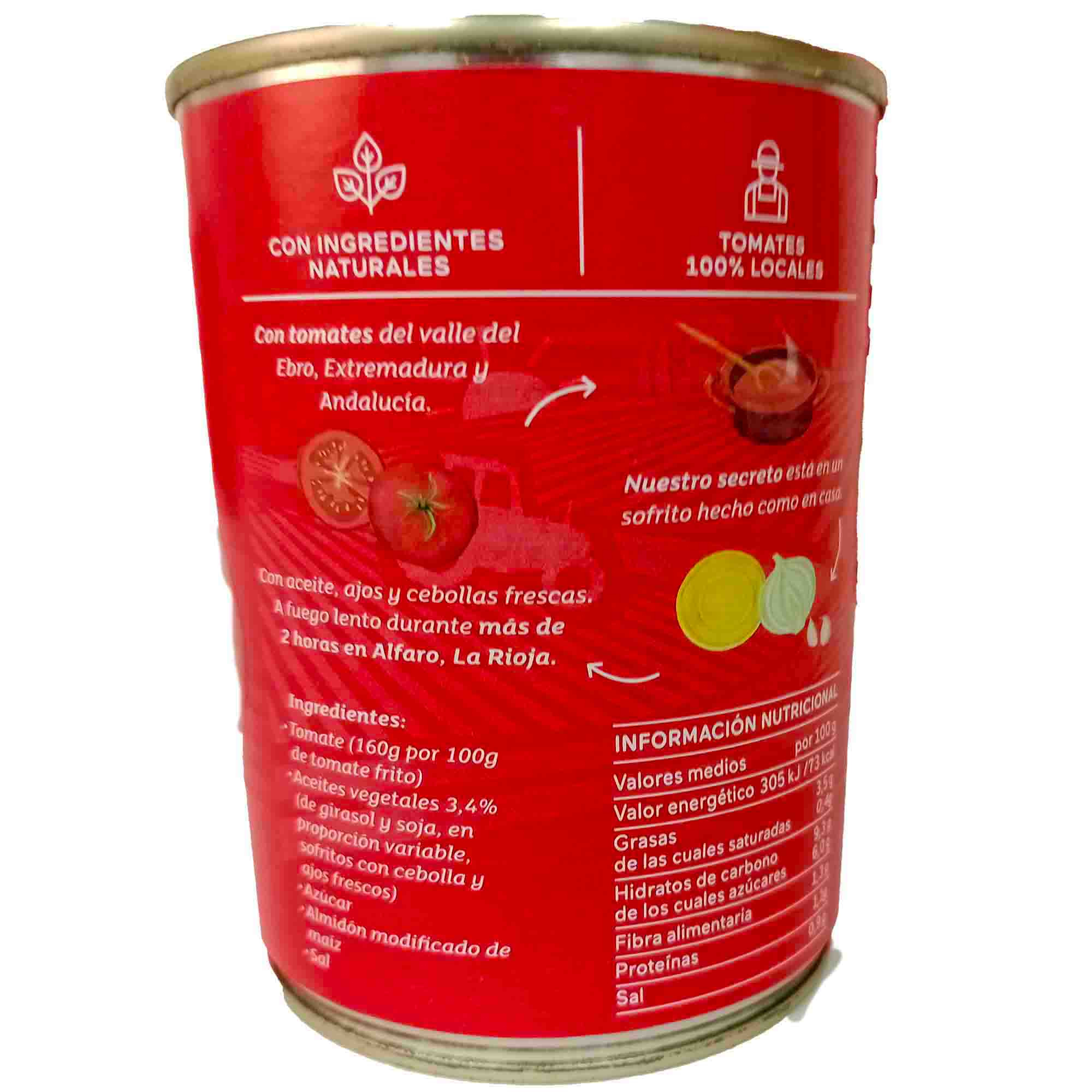 - Tomatoes (160g per 100g of sauce), sunflower oil, sofrito with onions and natural garlic (3.4%), sugar, cornstarch and salt.