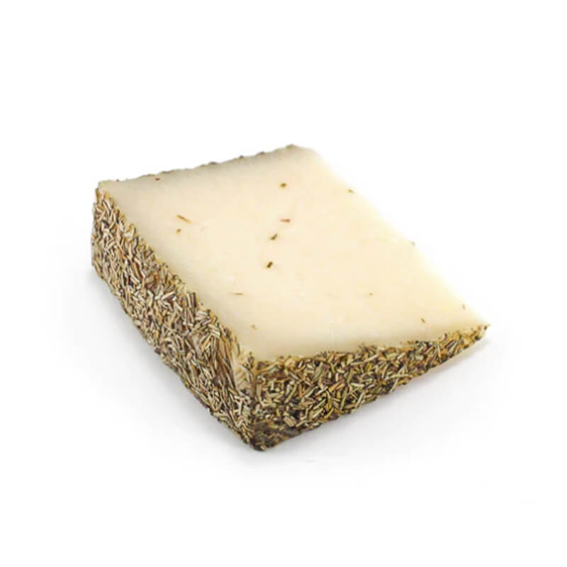 Made with milk from free-range sheep and traditionally aged for 6 months. The flavours from the sheep’s milk and the rosemary both blend together, with fresh herbal aromas, and a rich, deep pepperiness. It has a firm interior, a bit dry in texture and slightly nutty and piquant.