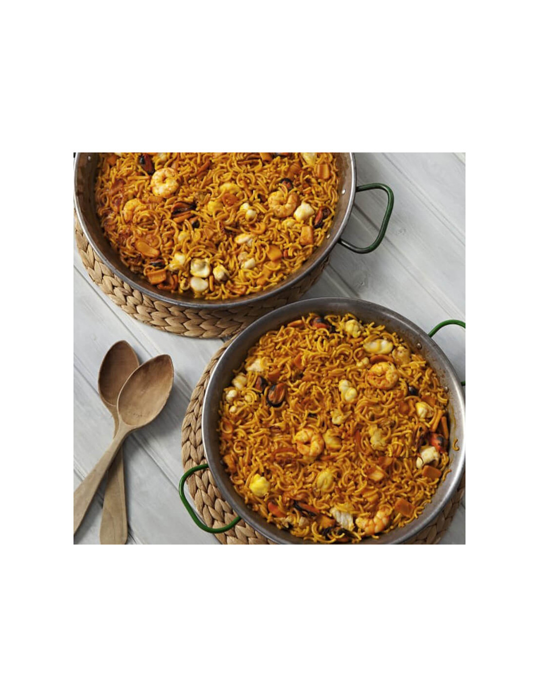 The essential ingredient for an authentic fideua. This noodle is actually a thin, hollow tube, made from durum wheat semolina. Fideua is a delicious dish from Cataluna similar to paella, usually prepared with seafood. It's even simpler to prepare than paella because it takes less than 15 minutes for the pasta to be cooked.