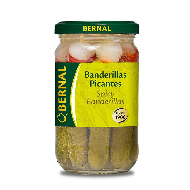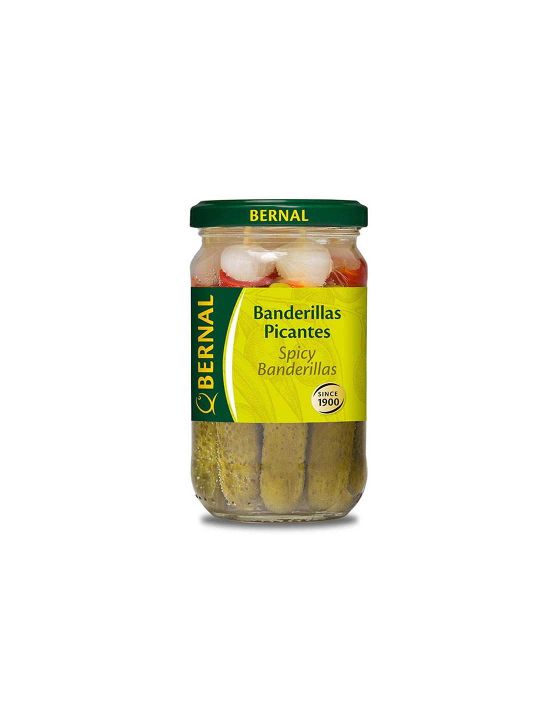 One of the most popular Spanish pintxos, traditional in Northern Spain and especially popular in the Basque country and Navarre, now in a jar, ready to eat! Banderilla is a small snack, typically eaten in bars, containing a gherkin, an olive, a cocktail onion, a small piece of bell pepper and one of chilli pepper pickled in vinegar.